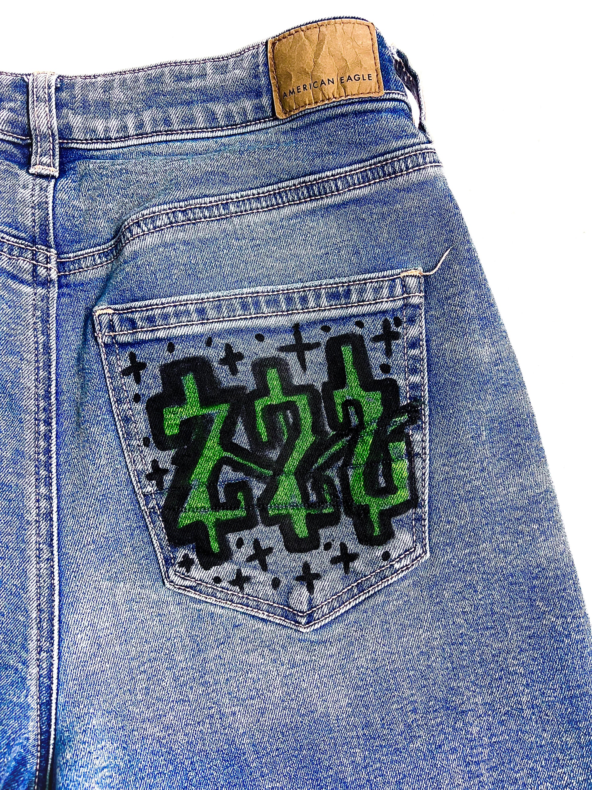 The symbols scattered across the denim echo your internal dialogue creativity, doubt, love, setbacks, resilience all coexisting as part of the journey. The arrows point forward because stagnation is not your nature. You were designed to move, to evolve, to redefine your own finish line.